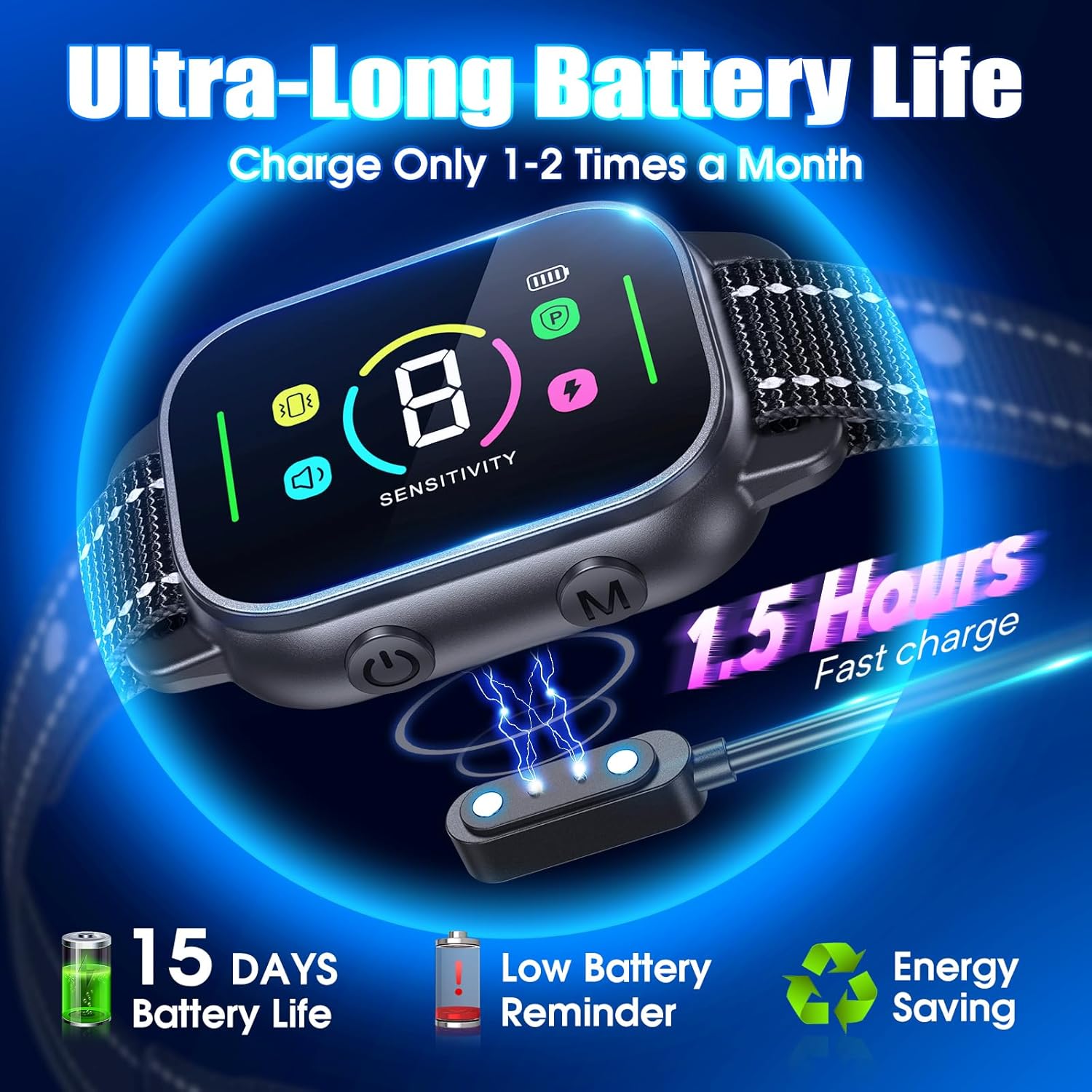 1.5 Hour Fast Charging: Enjoy up to 15 days of battery life without frequent recharging; NHUJK Bark Collar for medium dogs features battery level display and low battery reminders for convenient usage; With an IP67 waterproof, anti bark device for dogs can be used indoors and outdoors, suitable for all occasions